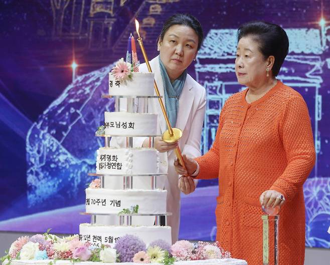70돌 축하의 촛불 한학자 세계평화통일가정연합 총재(오른쪽)와 문연아 총재비서1실 비서실장이 6일 경기 가평 HJ천주천보수련원에서 열린 세계평화통일가정연합 창립 70주년 기념식에서 기념 케이크에 촛불을 붙이고 있다. 가평=최상수 기자