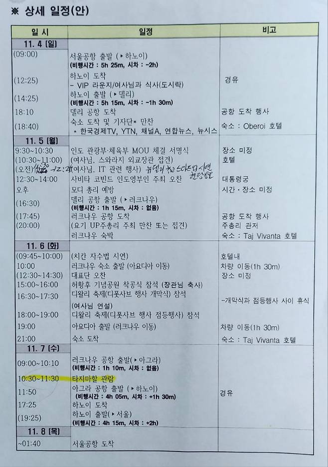 ◆ 도종환> 그러니까 트럼프 대통령 내외가 왔을 때도 타지마할 방문했었고 또 마크롱 대통령이 왔을 때도 그러고 캐나다 트뤼도 총리가 왔을 때도 그러고 외국 정상이 오면 반드시 그 타지마할 방문 요청을 합니다. 그래서 당연히 사전에 들어가는 거예요. 사전에 들어가지 않은 일정은 없어요.