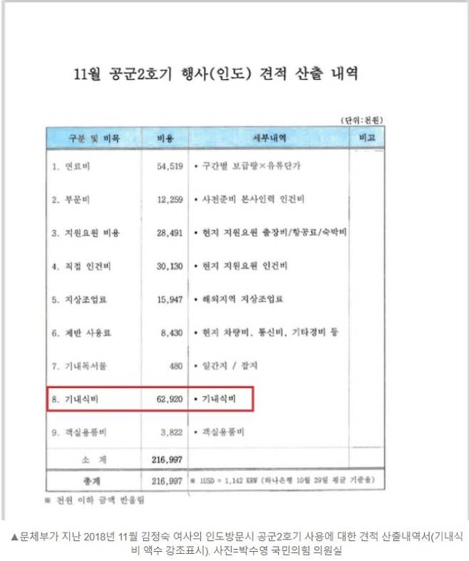 지금 세간에서는 혹시 여기 이 내용에 셀프 초청을 암시하는 게 들어있기 때문에 공개 못 하는 거 아니야? 이런 의혹이 있는데 이렇게 다 공개를 합니다. 공개한다는 거 말씀을 드리고 기내식 이야기로 좀 넘어가겠습니다. 결국은 셀프 초청으로, 그러니까 김정숙 여사가 원해서 이 여행에 합류하게 되면서 돈이 올라간, 그러니까 예산이 쑥 올라간 거 아니야? 이렇게 이야기가 연결되는 거 아니겠습니까? 수천만 원으로 잡혀 있던 예산이 갑자기 예비비 4억 원을 더 추가한 예산으로 급등했다. 민항기가 전세기가 되고 거기다가 호화 기내식까지 책정이 됐다. 한 36명이 냈기에 6000여만 원, 정확히는 6929만원을 사용했다는 내역서 보여주십시오. 내역이 나왔다는 거예요. 장관님. 네 끼에 6292만 원을 36명을 나눠보면 한 43만 원 정도 된다고 이렇게 또 계산이 나오더라고요. 이건 어떻게 된 걸로 알고 계십니까?