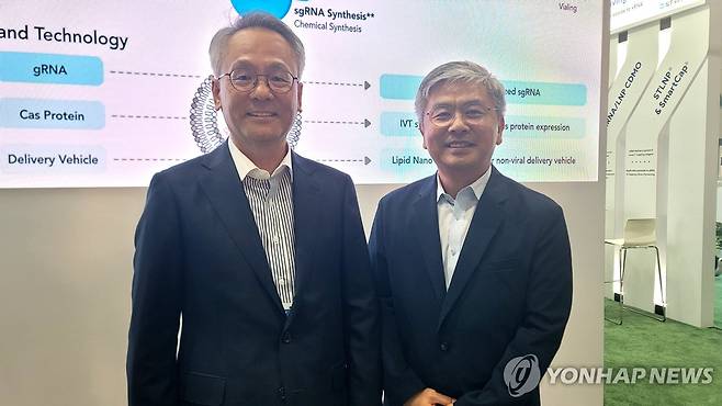(샌디에이고=연합뉴스) 나확진 기자 = 김경진 에스티팜 대표(왼쪽)와 성무제 부사장이 6일(현지시간) 미국 샌디에이고에서 진행된 바이오 인터내셔널 컨벤션(바이오USA)에서 기념 촬영하고 있다. 2024.6.7
