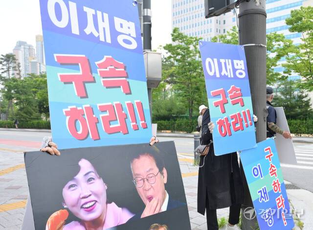 이화영 전 경기도 평화부지사의 1심 선고 결과를 앞둔 7일 오후 수원지방법원 앞에서 열린 보수단체 애국순찰팀 회원들이 더불어민주당 이재명 대표의 구속을 외치고 있다.