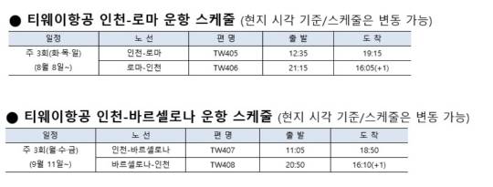 티웨이항공, 인천~로마·바르셀로나 항공권 예매 오픈