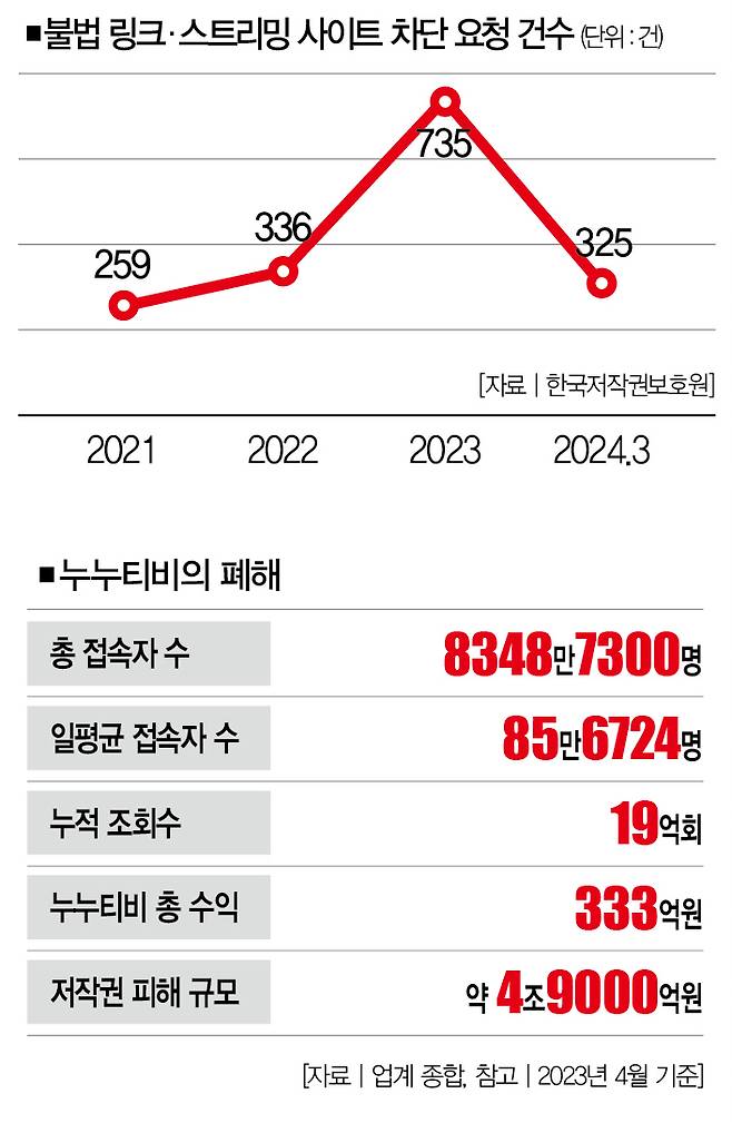 지금으로부터 1년 전, OTT 업계는 불법으로 콘텐츠를 송출하는 사이트 '누누티비'로 홍역을 앓았습니다. 당시 과학기술정보통신부의 조사에 따르면 2023년 4월 기준 총 8348만7300명이 누누티비에서 불법 콘텐츠를 시청했고, 그로 인해 4조9000억원 규모의 저작권 피해가 발생했습니다. 그 기간 누누티비가 거둬들인 수익은 무려 333억원에 달했죠.