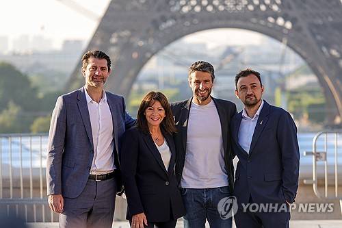 epa11394902 (L-R) Deputy Mayor of Paris in charge of sport Pierre Rabadan, Paris Mayor Anne Hidalgo, President of the Paris 2024 Organizing Committee for the Olympic and Paralympic Games Tony Estanguet and President of the Eiffel Tower operating company Jean-Francois Martins pose for a picture during the unveiling of the Olympic rings on the Eiffel Tower 50 days before the Paris 2024 Olympic and Paralympic Games in Paris, France, 07 June 2024. Summer Olympics will be held in Paris, France, from 26 July to 11 August 2024. EPA/TERESA SUAREZ