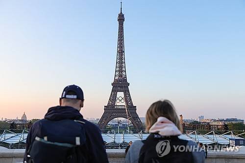 epa11394897 People watch the Olympic rings' installation on the Eiffel Tower 50 days before the Paris 2024 Olympic and Paralympic Games in Paris, France, 07 June 2024. Summer Olympics will be held in Paris, France, from 26 July to 11 August 2024. EPA/TERESA SUAREZ