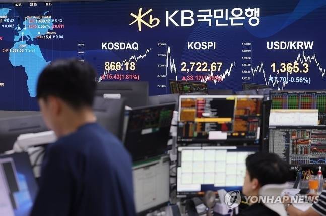 [코스피가 1% 넘게 올라 2,720대에서 마감한 7일 오후 서울 여의도 KB국민은행 딜링룸에서 직원이 업무를 보고 있다. (사진 = 연합뉴스)]