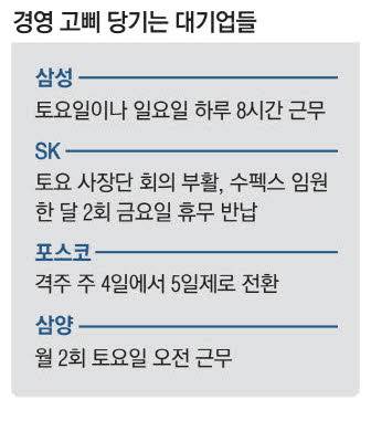 포스코는 토요 근무는 아니지만 임원들의 격주 주 4일제 근무를 주 5일제로 전환한다고 지난 5일 공지했다.