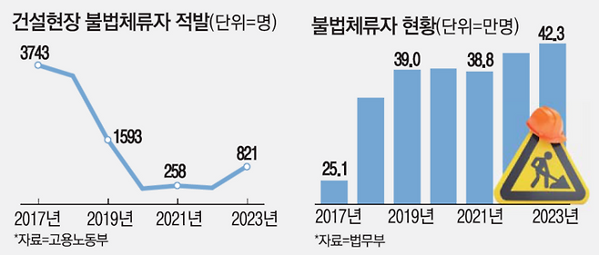 그러다보니 건설현장 불법체류자들에 대한 단속자체가 제대로 이뤄지지 않고 있다는 지적이다. 본지가 고용노동부에서 입수한 자료에 따르면 불법 체류외국인은 2017년 25만1041명에서 지난해 42만3675명으로 1.7배 증가했다. 반면 같은 기간 건설현장 불법체류자 적발수는 3743명에서 821명으로 오히려 줄었다. 이는 실제 불법체류자 숫자 자체가 줄었기 때문이라기 보다는 실효성 있는 단속이 이뤄지지 않았기 때문이라는게 현장 관계자들의 설명이다. 한 업계 관계자는 “불법체류자 없이는 건설현장이 돌아가지 않는 상황에 단속할 엄두를 못내는 것 같다”고 말했다.