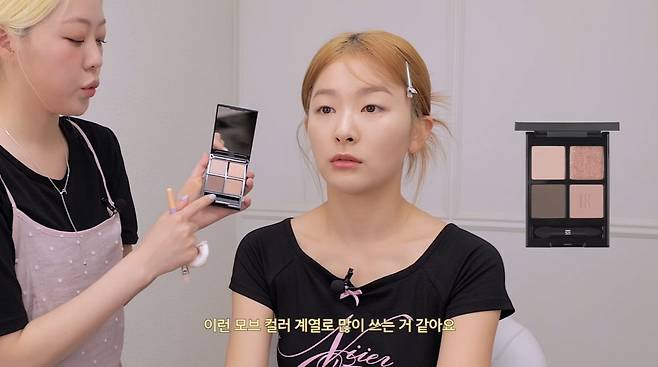 슬기는 "언니가 무쌍이긴 한데 어려운 무쌍은 아니다. 정말 예쁜 무쌍"이라며 "눈 화장의 특징은 전체적 색감을 쨍하게 쓰지 않으려고 한다. 섀도 범위가 너무 높아지거나, 컬러를 잘못된 걸 쓰면 부어보일 수 있다"고 말했다.
