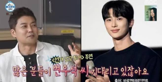 전현무 역시 “당시 많은 분들이 변우석씨를 기다리고 있었다. 변우석인 줄 알고 뒤에서 우루루 와서 ‘와아’하다가 전현무임을 알고는 ‘어우’라며 썰물처럼 빠지더라”고 1초 변우석이 됐던 당시를 소환하며 폭소를 자아냈다. 이에 코드쿤스트는 “댓글 중에 ‘무무 두고 튀어’라는 댓글이 있더라”고 거들며 웃음을 더했다.