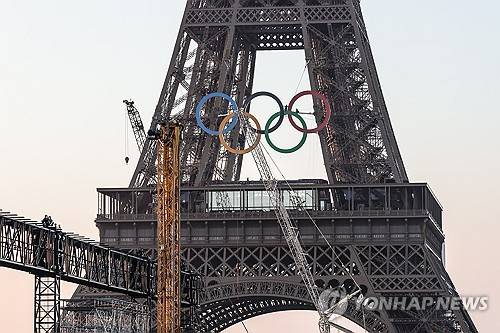 epaselect epa11394908 Teams from ArcelorMittal, official partner of the Paris 2024 Games, install the Olympic rings on the Eiffel Tower 50 days before the Paris 2024 Olympic and Paralympic Games in Paris, France, 07 June 2024. Summer Olympics will be held in Paris, France, from 26 July to 11 August 2024. EPA/TERESA SUAREZ