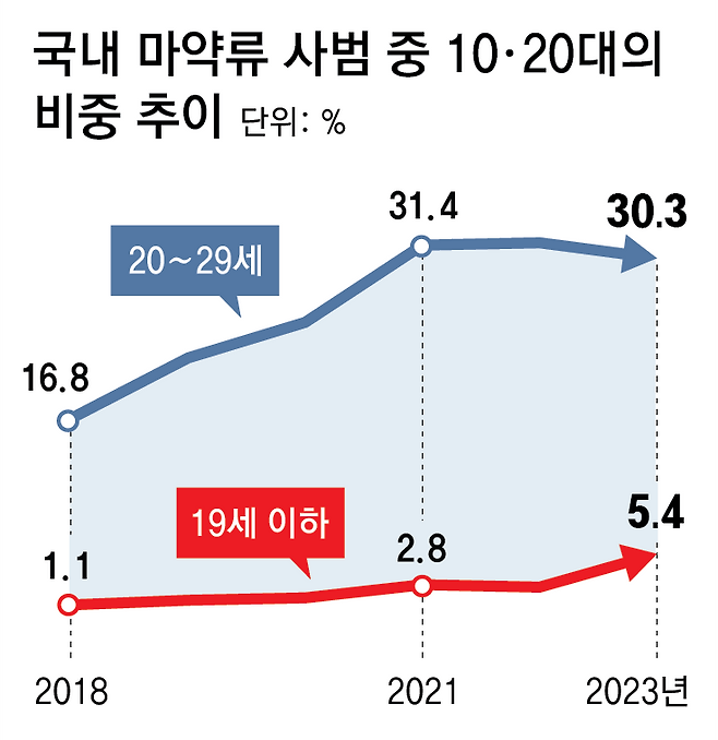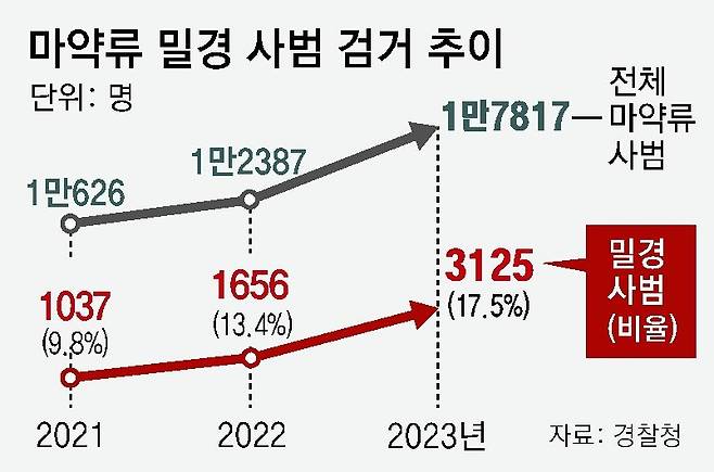 경찰청에 따르면 마약류 밀경 사범은 2021년 1037명에서 2022년 1656명, 지난해 3125명 등으로 2년 새 3배로 늘었다. 특히 전체 마약류 사범 중 밀경이 차지하는 비율이 같은 기간 9.8%에서 13.4%, 17.5%로 급등했다. 지난해 전체 마약류 사범이 1만7817명으로 사상 최다였는데, 그중에서도 밀경이 급증했다는 뜻이다.