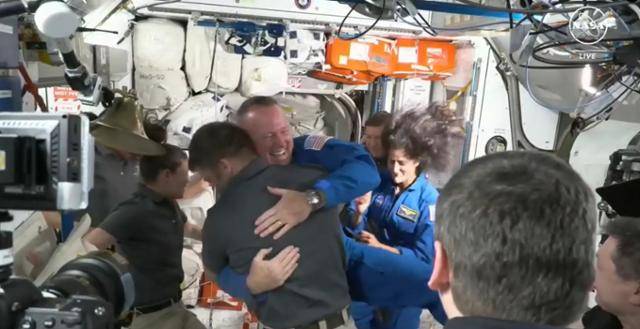 미국 보잉사의 '스타라이너'에 탑승한 우주비행사 부치 윌모어(가운데 파란색 제복)와 수니 윌리엄스가 6일 국제우주정거장(ISS) 도킹에 성공한 후 ISS에 체류 중이던 동료들의 환영을 받고 있다.