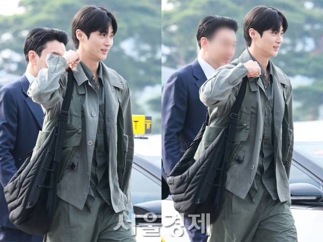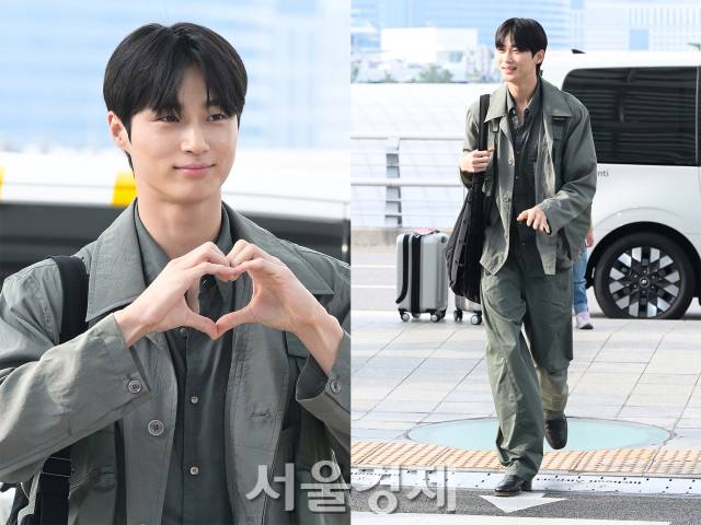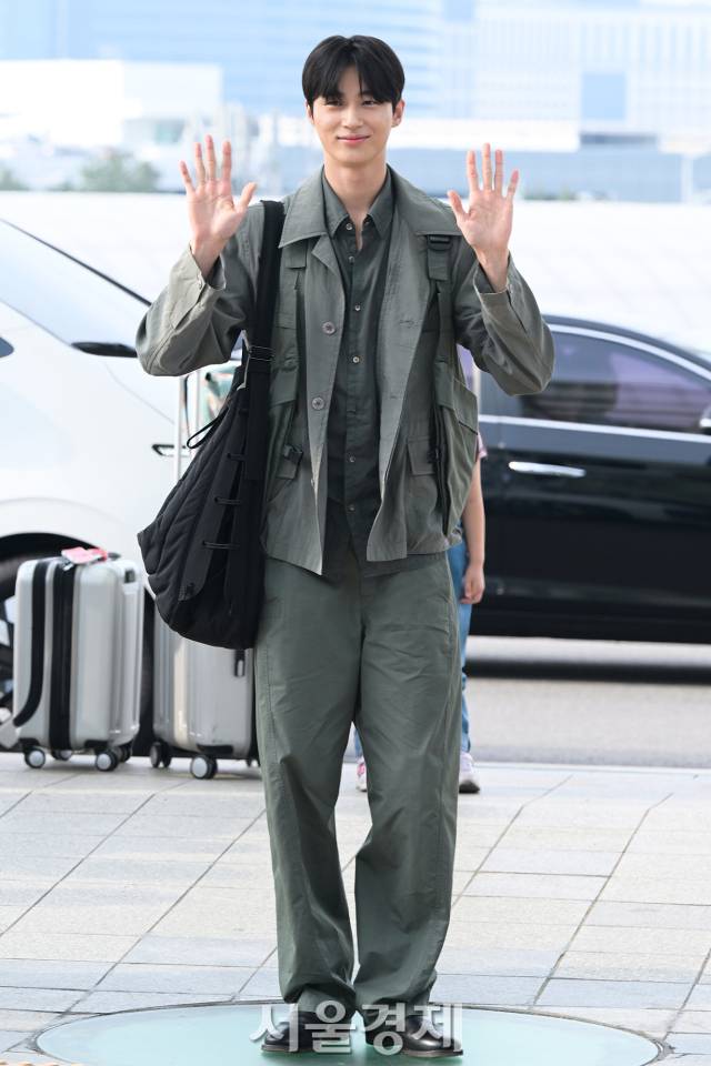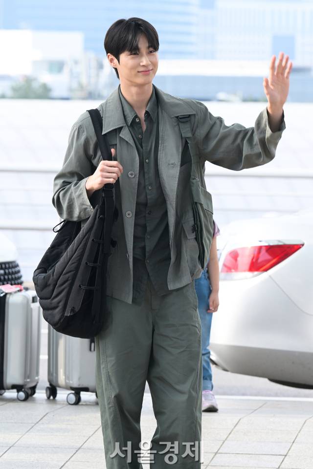 변우석은 프랑스 명품 브랜드 르메르의 풀 착장을 선보였다. 올 카키 컬러의 셋업으로, 숏 슬리브 반팔 셔츠 위에 오버 셔츠를 레이어링해 댄디한 공항 패션을 완성했다. 가격은 공식 홈페이지 기준 각각 80만원, 260만원대.