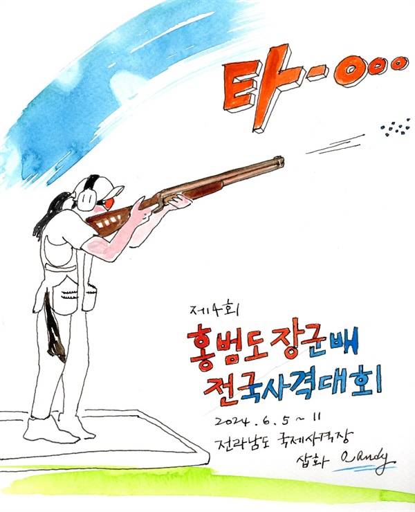 50m와 25m 화약총 종목을 가서 보니 총소리와 매캐한 화약 냄새로 경기가 실감나고 박진감 넘친다. 야외에서 하는 클레이 사격 경기를 하고 있었는데 총알을 장전하고 대기했다가 총을 쏘고 또 탄피를 버리는 동작이 참 절도 있고 멋지다. 클레이 사격은 일반인들도 좋아하는 종목이라고 한다. 클레이 사격하는 선수의 포스 넘치는 동작을 그렸다.