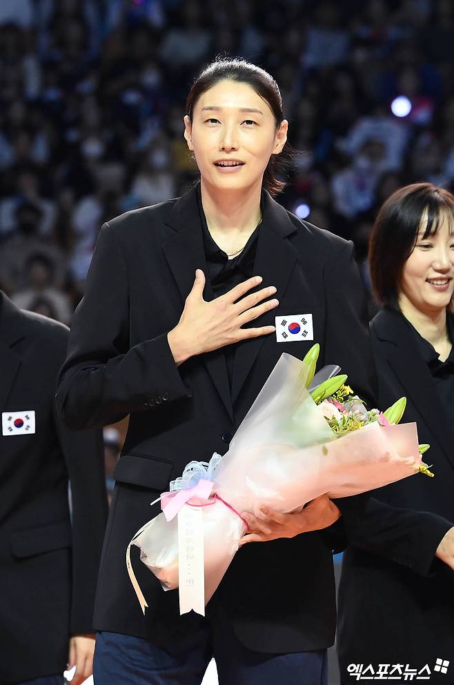 경기 종료 후 진행된 국가대표 은퇴식에 참석한 김연경이 팬들에게 인사를 전하고 있다.