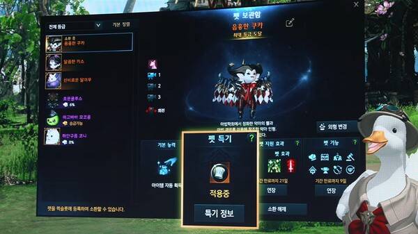 모든 펫에게 내실 효과인 '특기'가 무작위로 추가된다. 해당 효과들은 펫들을 영지 방범대로 배치하면 원정대 단위로 적용된다. 펫 특기가 마음에 들지 않는다면 훈련을 보내 새로운 특기로 바꿀 수 있다. 펫과 이별하는 시스템도 추가되어 펫을 정리하고 소량의 쿠키를 얻는 방법도 활용 가능하다.