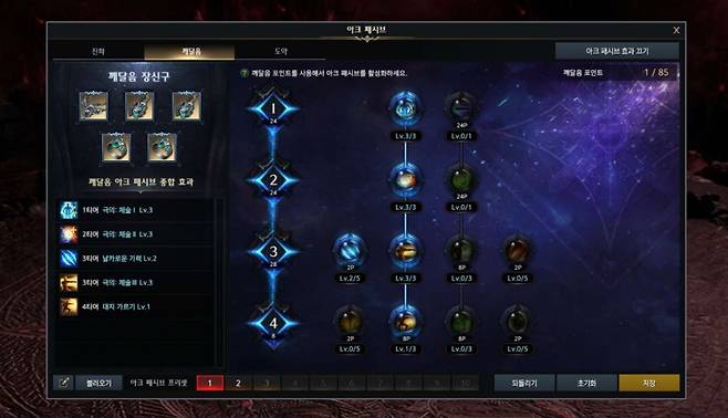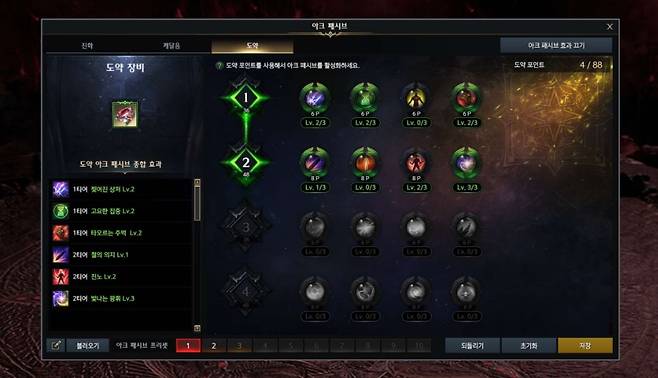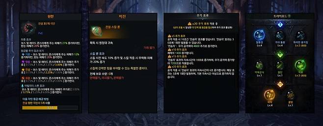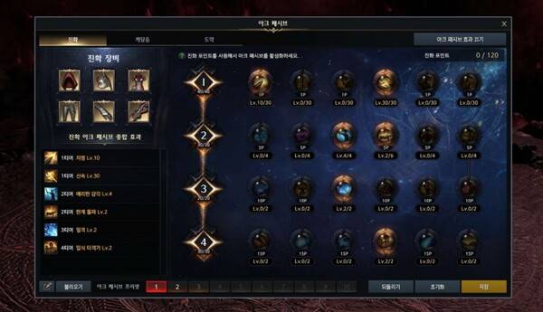 진화 탭은 기존 장신구 특성, 세트 장비 등 다양한 패시브 효과가 포함되어 있다. 깨달음 탭에서는 직업 각인을 대체하는 각 클래스의 고유 효과로 이뤄졌다.