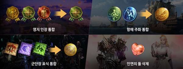 영지 인장, 항해 주화, 군단장 표식을 하나로 통합하고 인연의 돌을 삭제한다.