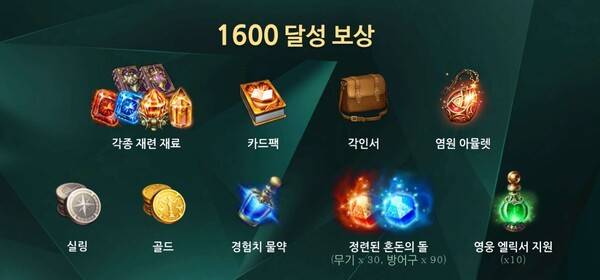 보상: 고대의 백금화 100개, 배틀 아이템 종합 선택 상자 40개, 페온 100개, 특별 전설 카드 선택 팩 1개, 메넬리크의 서 5개, 베아트리스의 축복(14일) 1개, 니나브의 축복(14일) 1개, 전설 전투 각인서 선택 상자 5개, 염원의 아뮬렛 상자 5개, 정령된 혼돈의 돌(무기) 30개, 정령된 혼돈의 돌(방어구) 90개, 카오스 던전 휴식 보너스 회복 비약 5개, 펫 기능 이용권(15일) 1개, 펫 지원 효과 이용권(15일) 1개, 24 썸머 모코코니 아바타 상자 1개, 24 썸머 코스모 로켓 선택 상자 1개, MNVP 배경: 여름 날의 추억, 24 인형탈 스페셜 선택 상자 1개