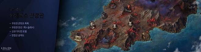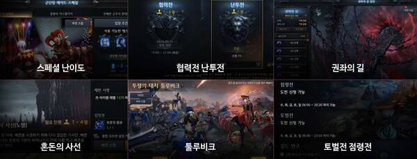 쿠르잔 북부 스토리를 완료하면 활성화 되는 콘텐츠다. 주요 콘텐츠들을 세계관에 몰입해서 즐길 수 있도록 쿠르잔 대륙 배경으로 설계한 목록이다. 카오스 던전과 비슷한 핵&슬래시 콘텐츠인 쿠르잔 전선, 신규 가디언 토벌, 연합군 공정도, 베히모스 레이드 등을 한 눈에 파악할 수 있다.