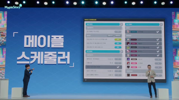 보다 편리한 콘텐츠 관리를 위한 '메이플 스케줄러' 기능이 추가된다. 메이플스토리에 있는 일일, 주간 퀘스트 및 보스 콘텐츠 수행 여부를 한 눈에 체크할 수 있다. 유저 입맛에 따라 UI를 편집할 수 있는 기능도 있다. 신규 유저들의 콘텐츠 접근 루트로서도 활용이 가능하다. 황금 전구를 대신해 화면 좌측 UI에 추가된다.