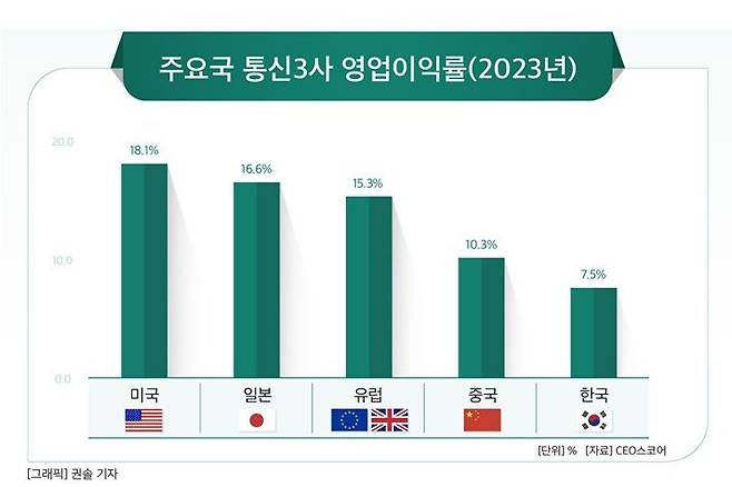 9일 CEO스코어가 집계한 국내 이통사 영업이익률은 7.5%로 미국(18.1%)이나 일본(16.6%), 유럽(15.3%)에 크게 못 미쳤다. 중국(10.3%)에도 뒤졌다.