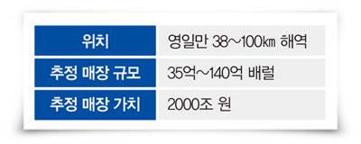 정부는 영일만에 원유·가스가 1 대 3 비율로 매장됐을 것으로 추정한다. 원유보다 가스 매장량이 훨씬 많은 가스전 형태다. 원유·가스 매장량이 140억 배럴로 확인될 경우 한국에서 원유는 4년, 가스는 29년 사용할 수 있는 양이다. 경제적 가치를 단순 추산하더라도 2000조 원에 달한다. 삼성전자 시가총액의 5배 규모다. 이는 1990년대 후반 발견된 동해 가스전의 300배가 넘는 수준이다.