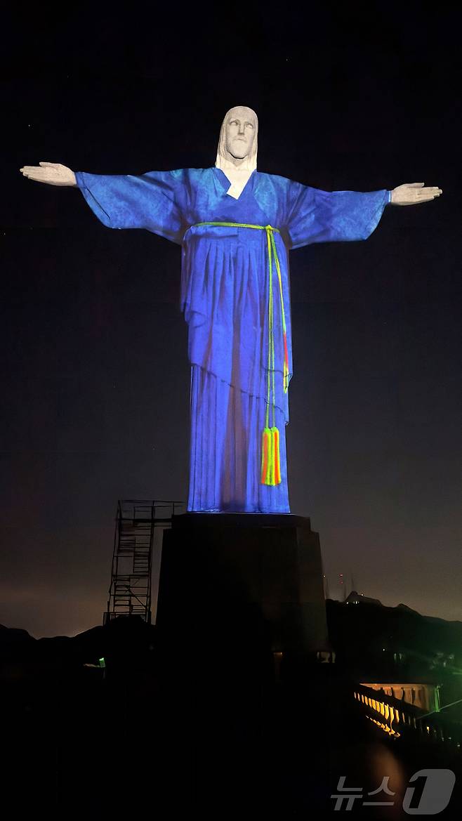 (서울=뉴스1) 박지혜 기자 = 지난 7일(현지시간) 브라질 리우데자네이루에 위치한 브라질의 대표적 상징물인 거대 예수상이 사상 처음으로 대한민국 전통 의상인 한복을 곱게 차려입고 있다.