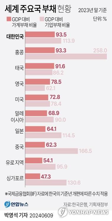 (서울=연합뉴스) 박영석 기자 = 9일 한국은행과 기획재정부에 따르면, 지난해 말 기준 한국의 GDP 대비 가계부채 비율은 기준 연도를 2015년에서 2020년으로 변경한 데 따라 100.4%에서 93.5%로 6.9%포인트(p) 낮아졌다.