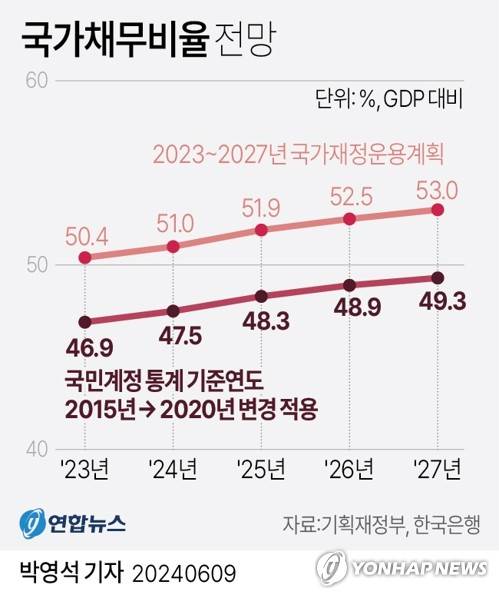 (서울=연합뉴스) 박영석 기자 = 9일 기획재정부와 한국은행에 따르면 최근 GDP 등 국민계정 통계의 기준연도가 2015년에서 2020년으로 변경되면서 GDP 대비 국가채무(D1) 비율은 작년 말 50.4%에서 46.9%로 내려갔다.