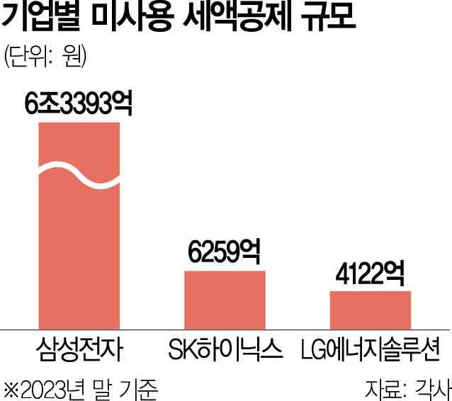 9일 금융감독원에 따르면 지난해 삼성전자와 SK하이닉스의 미사용 세액공제분은 각각 6조 3393억 원과 6259억 원이었다. 지난해 메모리반도체 시장이 불황을 맞으면서 두 회사의 실적이 급격히 나빠졌기 때문이다. LG에너지솔루션의 세액공제 이월액도 4122억 원이나 된다.