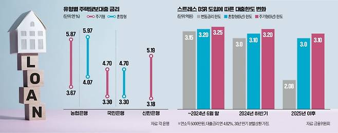 주기형과 혼합형 주담대의 대출 한도가 다르다는 점도 유의해야 한다. 올해 2월 도입된 스트레스 총부채원리금상환비율(DSR) 때문이다. 예를 들어 연 소득이 5000만원인 개인이 올해 하반기 30년 만기 분할상환 방식으로 주담대를 받을 경우 주기형을 택하면 3억2000만원을 빌릴 수 있지만, 혼합형으로는 3억1000만원만 빌릴 수 있다.