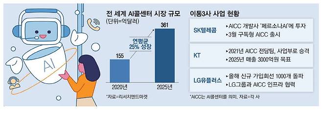 시장조사업체 리서치앤드마켓에 따르면 전 세계 AICC 시장 규모는 2020년 155억달러(약 21조3000억원)에서 2025년 361억달러(약 49조5500억원)로 연평균 25% 성장할 전망이다.