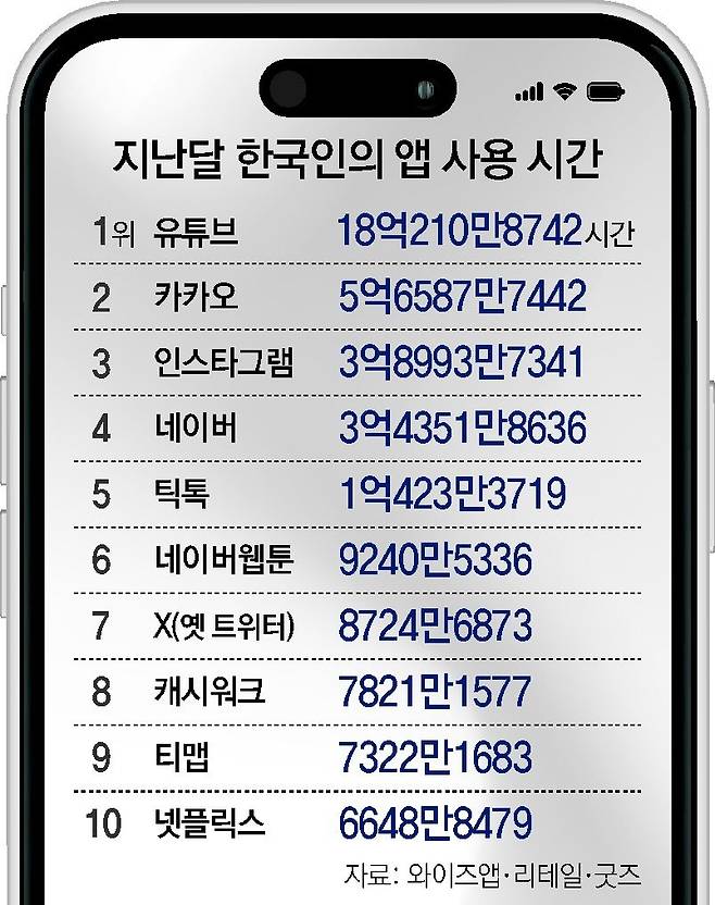 지난달 최장사용 앱 1-3-5위 차지