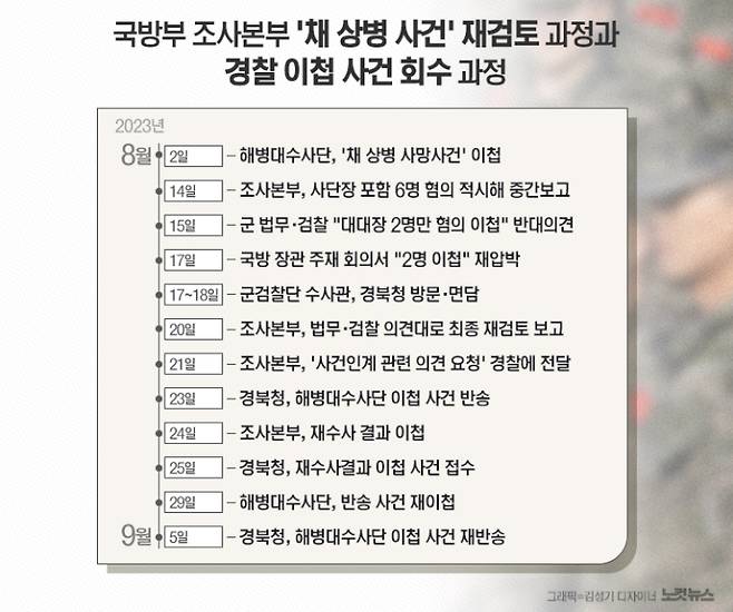군검찰의 경북청 방문은 8월 17~18일, 국방부 조사본부 재수사 최종보고서는 이틀 뒤(20일), 하루 만에 다시 조사본부가 경북청에 '이첩 공문 반송'을 요구(21일)한 것이다. 마치 군사작전처럼 긴밀히 이뤄진 모양새다.