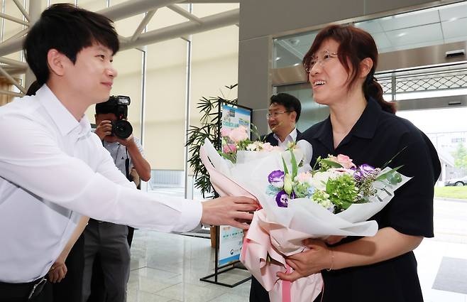 | ▲ 장미란 문화체육관광부 2차관이 2023년 7월 4일 오전 세종시 정부세종청사로 출근하며 직원에게 꽃다발을 받고 있다. |