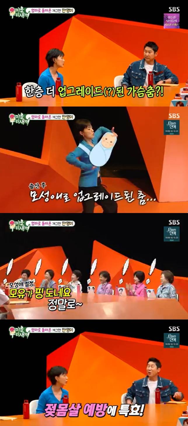 이어 "모유가 핑 도네요 정말로"라며 출산 후 업그레이드된 가슴 춤을 스튜디오에 선사해 어머니들이 감탄했다. 안영미는 "가슴춤이 젖몸살 예방에 도움이 된다"며 가슴춤을 장려하기도 했다.