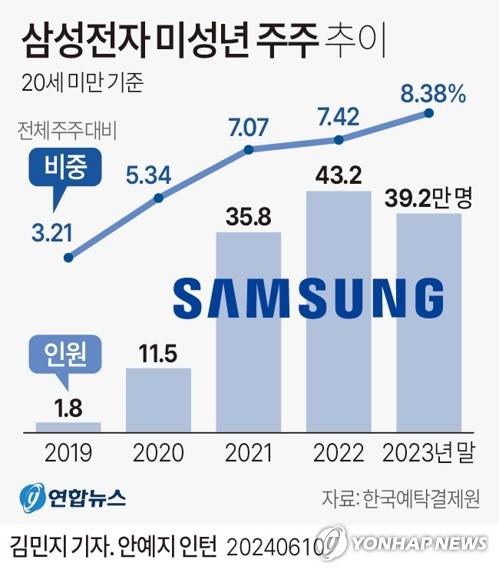 (서울=연합뉴스) 김민지 기자 = 10일 한국예탁결제원 증권정보포털 세이브로에 따르면 작년 말 기준 삼성전자의 20세 미만 주주는 39만1천869명으로 전체 주주의 8.38%를 차지했다.