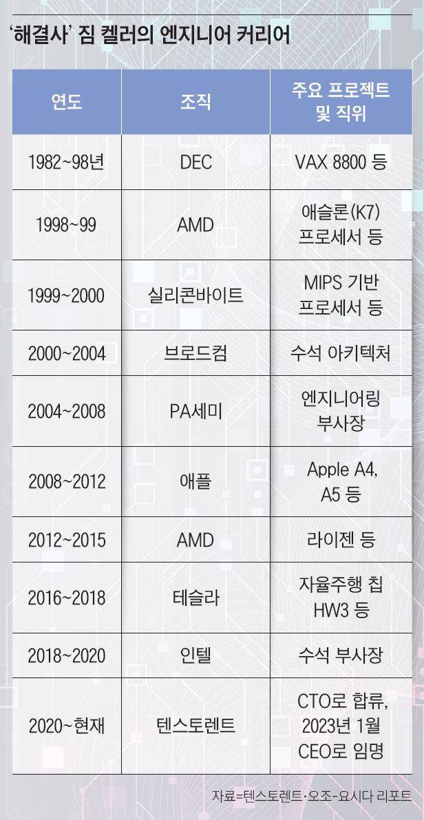 당시 이를 실현한 인물이 ‘반도체 설계의 전설’로 불리는 짐 켈러다. 테슬라의 자율주행 칩뿐만 아니라 지금의 AMD를 있게 만든 ‘애슬론’과 ‘라이젠’ 시리즈도 그의 손을 거쳐 탄생했다. 애플에선 스마트폰의 두뇌 격인 모바일 애플리케이션 프로세서(AP) ‘A4’와 ‘A5’를 만들었다.
