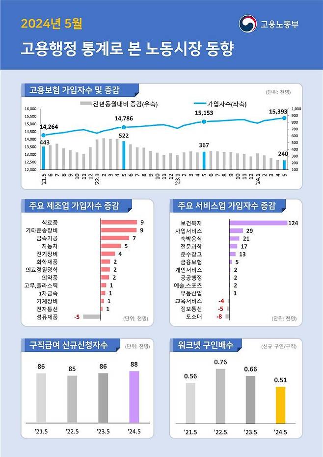 한편 5월 중 구직급여 신규 신청자 수는 8만8000명으로 건설, 정보통신, 사업시설관리, 전문과학기술 등을 중심으로 전년동월대비 2000명(+1.8%) 증가했다. 구직급여 지급자는 64만6000명으로 전년동월대비 1만1000명(-1.6%) 감소했고, 지급액은 1조786억원으로 148억원(+1.4%) 증가했다.