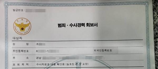 | ▲ 조씨가 <오마이뉴스>에 공개한 자신의 범죄수사경력 회보서의 일부. |