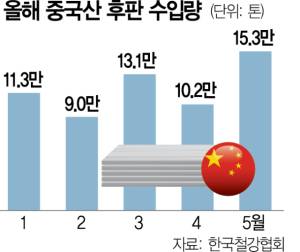 10일 한국철강협회에 따르면 지난달(5월) 중국산 후판 수입량은 15만 3000톤으로 4월(10만 2000톤)보다 5만 1000톤(33%) 늘었다. 월간 기준으로 역대 최고다.