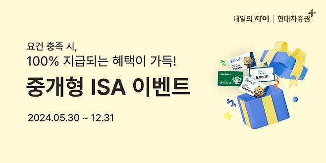 현대차증권은 지난 5월 30일부터 올해 말까지 중개형 ISA(개인종합자산관리계좌) 신규 계좌 개설(타사 ISA 계좌 이전 포함) 및 거래 이벤트를 실시한다고 10일 밝혔다.