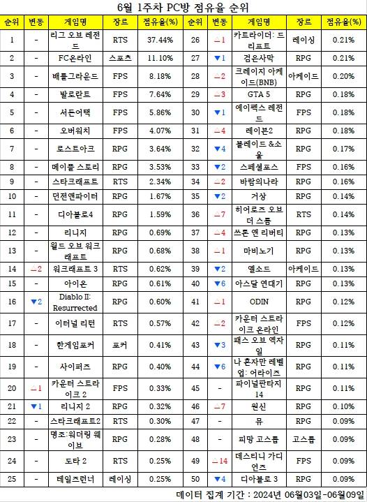 한 주간의 PC방 순위를 되짚어 보고, 어떤 변화가 있었는지 알아보는 'PC방순위' 코너입니다. 데일리게임은 매주 PC방 순위를 일목요연하게 정리, 독자들이 알아보기 쉽도록 제공합니다. 지난 한 주간 어떤 PC 온라인게임들이 눈길을 끌었는지 살펴봤습니다. < 편집자주 >