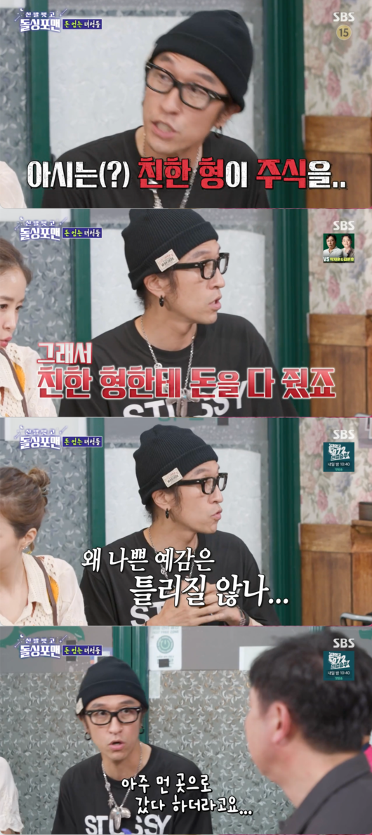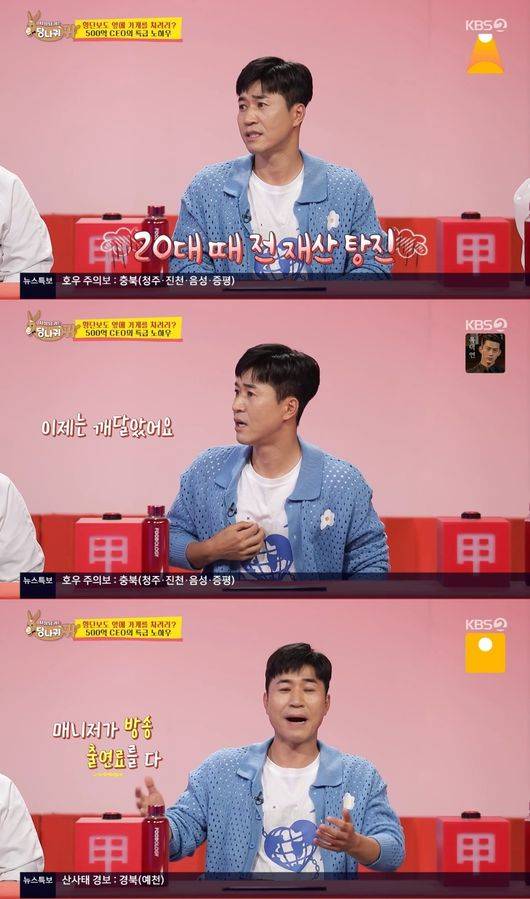이에 앞서 SBS '돌싱포맨'에서도 "김포 신도시가 생길 때 우연히 들어갔다. 집 3채를 샀다. 한 7~8년 지나니까 엄청나게 올랐다. 친한 형이 주식을 하는데 원금을 보장해준다고 했다. 돈을 주면 딱 3배를 주겠다고 했다. 집 3 채를 다 팔고 돈을 줬다. 연락이 안 되기 시작했다. 전화도 안 받고 집도 없었다. 아주 먼 곳으로 갔다고 하더라"라고 당시 상황을 자세히 전했다.
