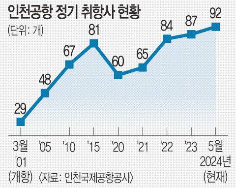 인천국제공항 정기선 취항 항공사 수가 처음으로 90개를 넘어서면서 국제허브공항으로 입지를 다지고 있다. 2001년 3월 개항 당시 취항 항공사 29개로 시작했으나 23년 만에 3배 이상 성장을 이뤘다. 인천공항 4단계 건설이 올해 안에 마무리되면 세계 3위 규모의 국제공항으로 입지를 다질 것으로 보인다.