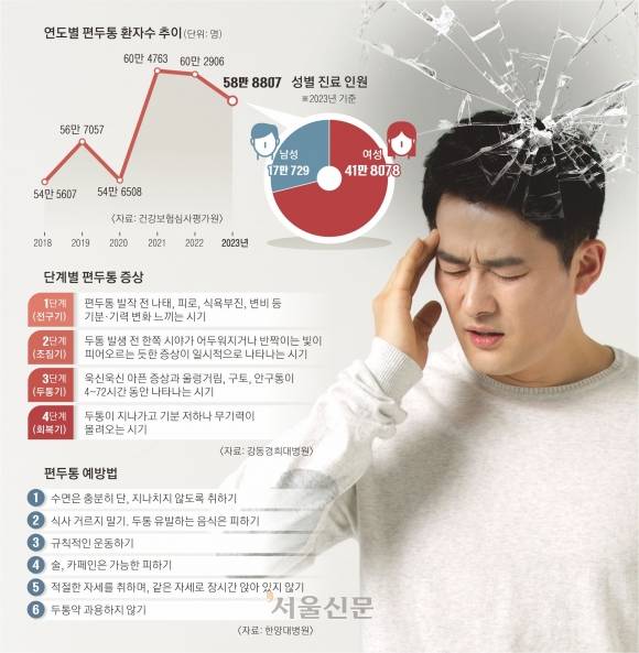 대한두통학회에 따르면 편두통은 성인의 8~17%가 앓을 만큼 흔한 질환이다. 특히 A씨처럼 월경 기간에 편두통을 호소하는 여성이 많다. 박광열 중앙대병원 신경과 교수는 “여성호르몬으로 알려진 에스트로겐이 편두통과 관련이 있기 때문”이라면서 “편두통은 에스트로겐 농도가 높아지는 임신 기간에 좋아지고 반대로 농도가 낮아지는 월경 기간엔 통증이 심해지는 경향이 있다”고 설명했다. 실제 가임기 여성(15~50세 사이)은 같은 연령대 남성보다 편두통 발생 확률이 3배 정도 높다.