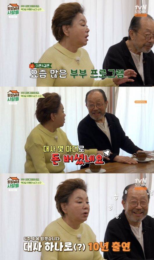 김수미는 신구를 향해 “사실 요즘 이혼 프로그램 많다. ‘사랑과 전쟁’이 모티브다. 선생님은 식은 죽 먹기로, '4주 후에 뵙겠습니다' 대사 몇 마디로 돈 버셨다”라고 말을 꺼냈다. 신구는 “10년은 했다”라고 말했다.