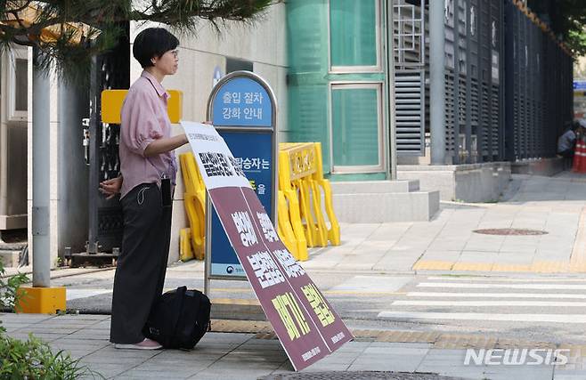 [서울=뉴시스] 김명원 기자 = 오미정 평화와통일을여는사람들(평통사) 활동가가 11일 오전 서울 종로구 외교부 정문 앞에서 한미 12차 방위비분담특별협정 체결을 위한 3차 협상 중단 촉구 1인 시위를 하고 있다. 2024.06.11. kmx1105@newsis.com